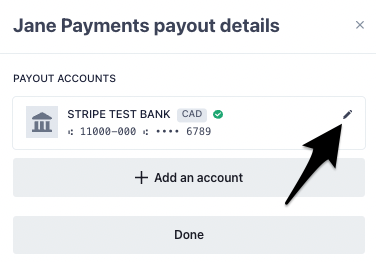 Head to your Settings > Jane Payments area, and click on the pencil icon beside your account.