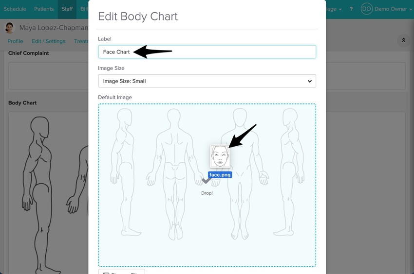 Here, you can edit the Label that appears above this item, add some standard text, and even swap out the body chart with any image of your choice if you’d like! If you’re using Smart Options and Narratives, this is where you would create that as well.