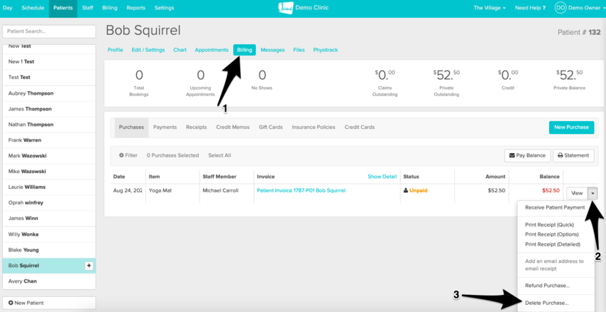 If you’re interested in deleting an invoice that was created for a product sale, you can pop on over to the Billing tab on your patient’s profile and click on the downward arrow to the far right on the product sale line. You’ll be able to see Delete Purchase listed as one of the options in this dropdown.