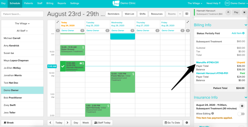It’s also good to note that arriving an appointment generates a patient invoice as well as an insurer invoice if there is an insurance policy attached to the appointment.