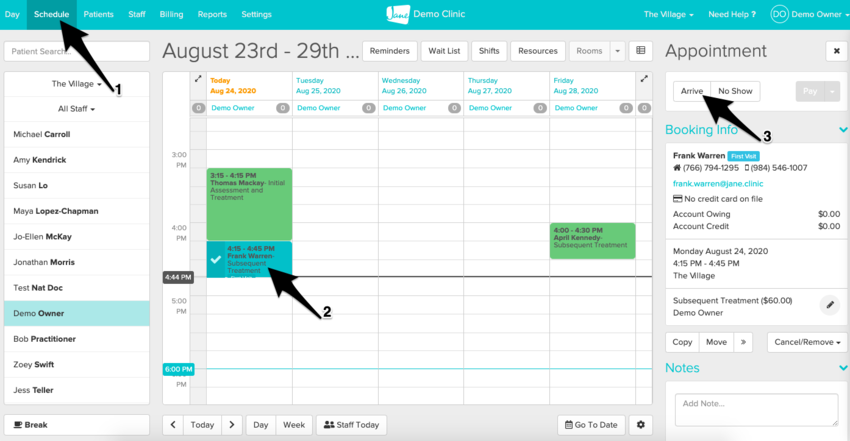 Generating an invoice for an appointment can be easily done by navigating to the Schedule, clicking on an appointment, and clicking the Arrive button in the appointment panel to the right.