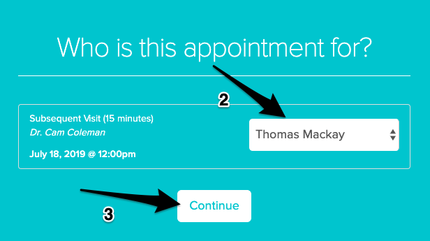 The workflow for booking an appointment on behalf of a family member is just like a patient booking an appointment for themselves.