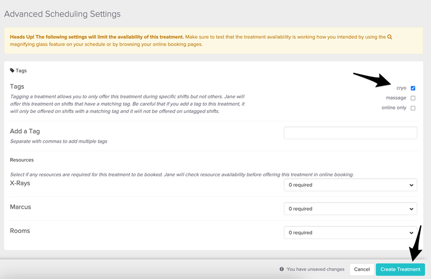 At the bottom of the treatment, you are creating you will see the advanced scheduling field, toggle on the appropriate tag here. Be sure to hit the blue Create Treatment button before navigating away.