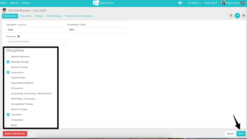 In their profile, select Edit/ Settings and toggle on the discipline you created for your service. Be sure to hit the blue Save button before navigating away.
