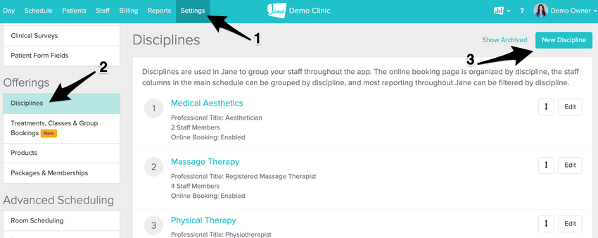 Next, we can create a discipline for the service. To do this, hop over to Settings> Disciplines > New Discipline.