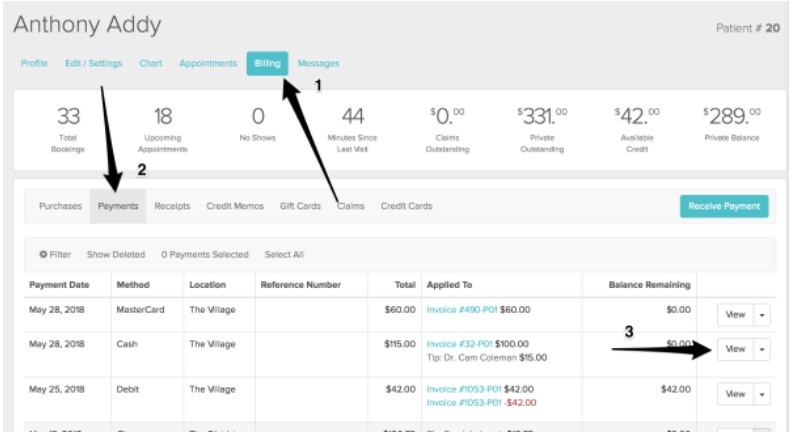 1 - Head to the patient’s Billing_Payments tab and “View” the payment that was used to underpay the invoice.