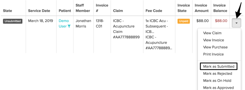 After submitting the claim to ICBC, mark the invoice as submitted via the drop-down arrow next to the claim: