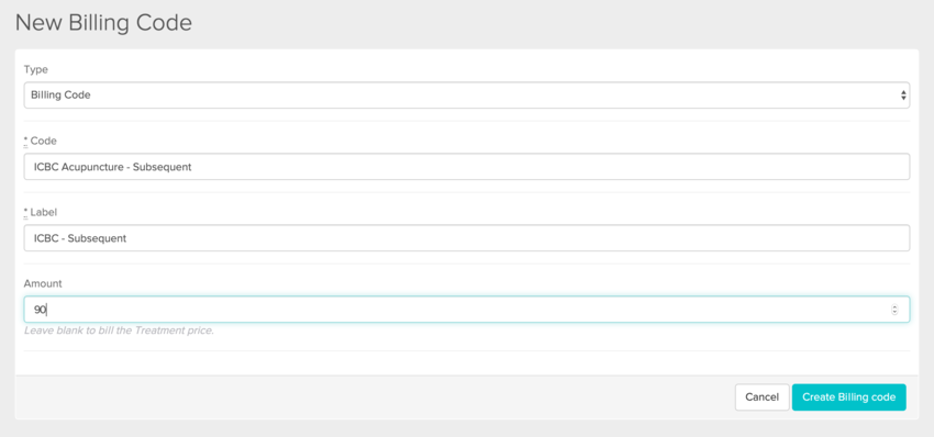 Custom billing codes can be created by heading to Settings > Billing Codes > New Billing Code