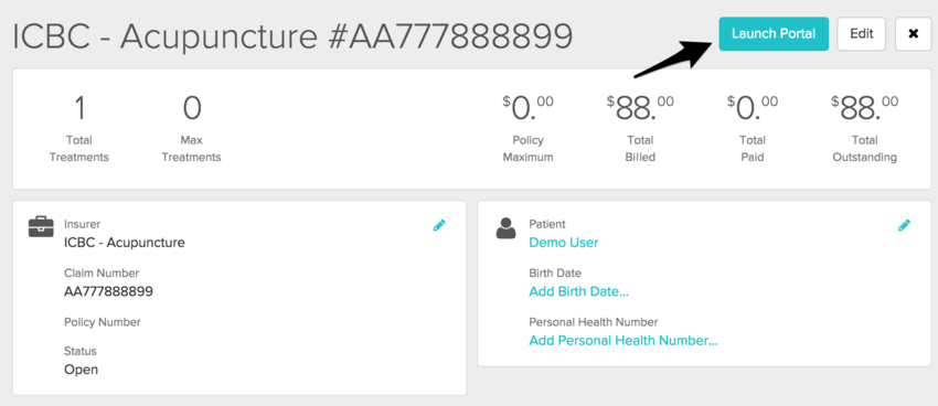 If you prefer to submit each claim as or after the treatment is happening, if you’ve added the link to the HCPIR form to the “Portal URL” field of your ICBC insurer, then you can launch the portal from the Claim Screen.