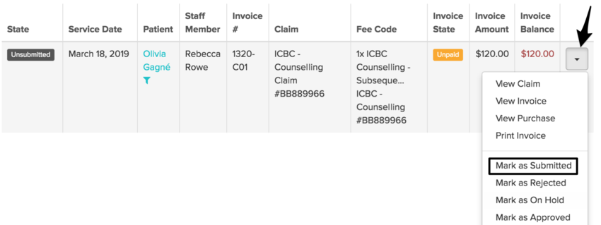 After submitting the claim to ICBC, mark the invoice as submitted via the drop-down arrow next to the claim: