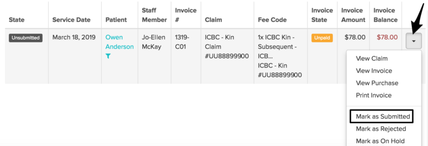 After submitting the claim to ICBC, mark the invoice as submitted via the drop-down arrow next to the claim: