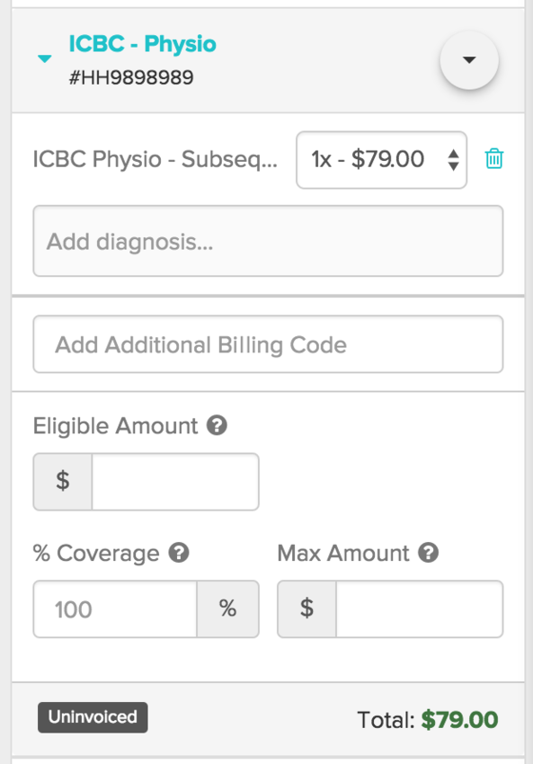 You can call it something like “ICBC - Physio”, and set the insurer’s default behaviour. If your fee schedule is higher per subsequent visit than what ICBC pays, you may choose to set either a user fee or set the insurer to default patient pays remaining so that the amount of the treatment not covered by ICBC is absorbed by the patient.