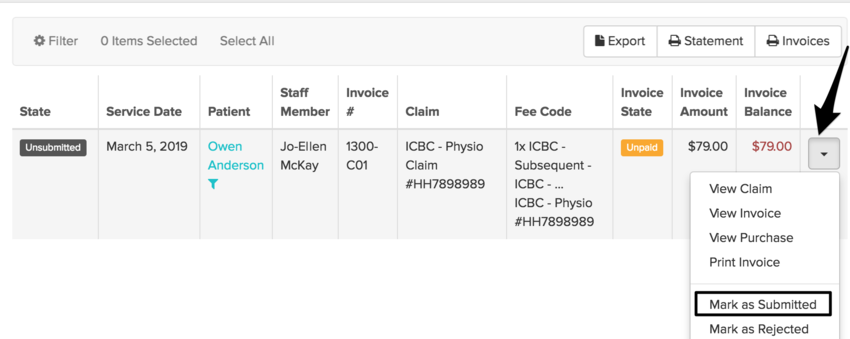 After submitting the claim to ICBC, mark the invoice as submitted via the drop-down arrow next to its name: