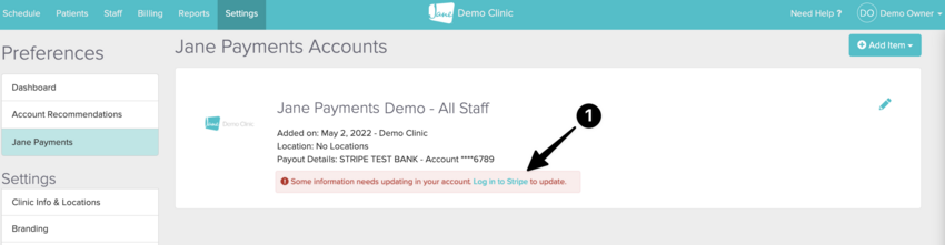 Don’t feel comfortable clicking a link in the email? We understand. You can access the same secure area right from your Jane account’s Settings > Jane Payments area, followed by the “Log in to Stripe” link listed by your account.
