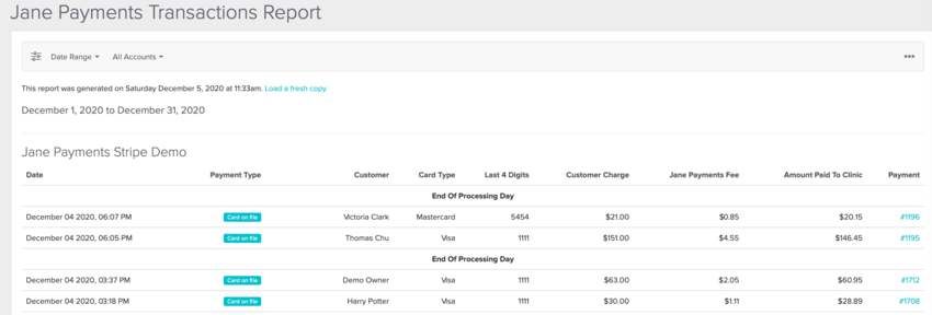 You may notice that there is a “End of Processing Day” banner in between certain transactions. Like all payment processors, Jane Payments (Stripe) has a daily payments cutoff time, so we can deposit these funds in a timely manner. This cutoff time is 8:59 PM pm PST/ 11:59 PM EST. All transactions that occur on the same processing date will be included in the corresponding payout.