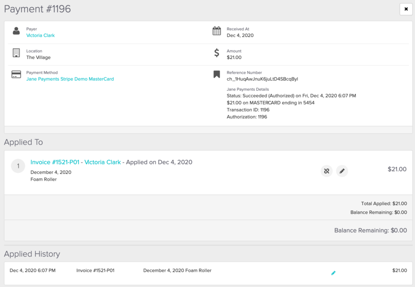- Payment: The unique Jane payment number associated with this transaction in Jane. Clicking on this link will redirect you to the payment itself (see below).