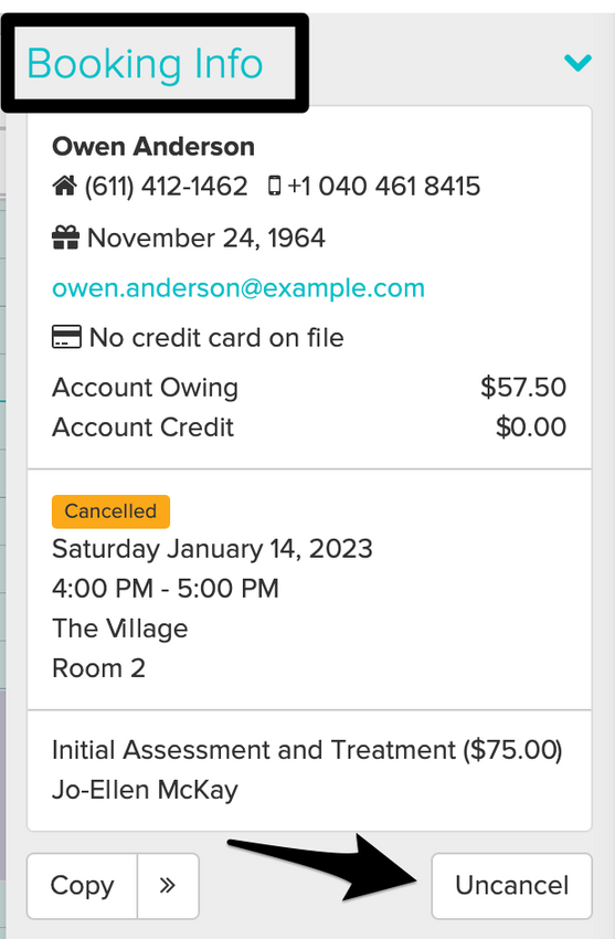Start by navigating to the appointment panel and, underneath the Booking Info section, you’ll want to click the Uncancel button: