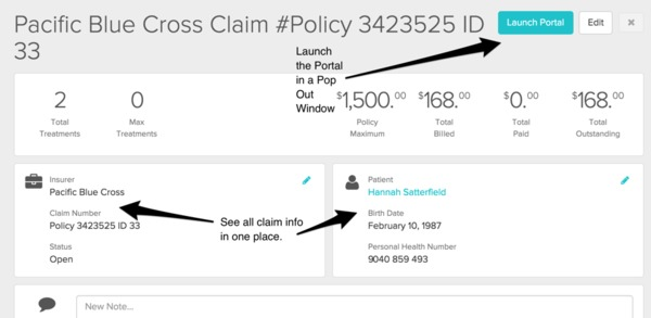 If you are billing to the portal immediately, you are able to click the blue insurer name at the top of the appointment panel to open the Claim Management Screen: