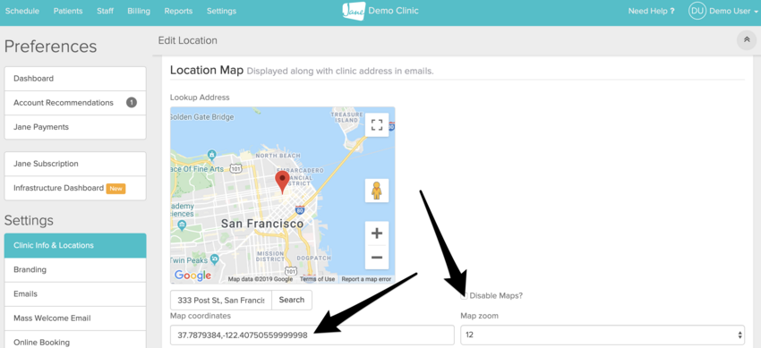 To enable your maps, head to Settings > Clinic Info & Locations > Edit. Scroll down to the Location Map area where you will need to search your address in the search field just below the map. Once the coordinates field has populated, you can uncheck the Disable Maps? checkbox and click Update Location.