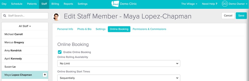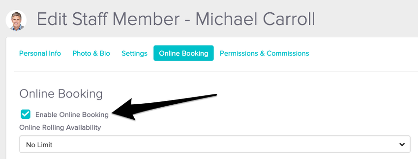 There are a few special ways you can have online booking offered per staff member. These settings can be found on their individual profiles by clicking Edit/Settings > Online Booking.