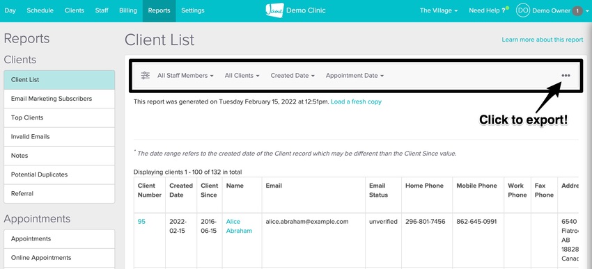 The Patient List report shows a list of your clinic’s patients (the ones entered into Jane), with their full name, their contact info, and other details.