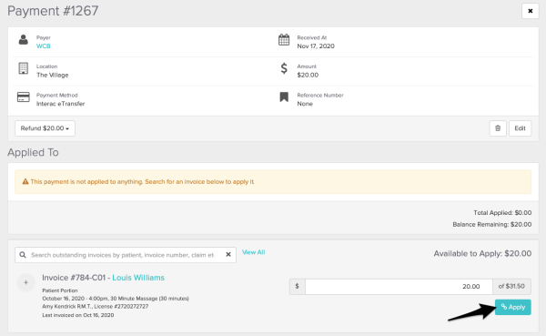 If the clinic ends up receiving the payment you’ll be able to manually record the amount received once you get that information in your statement from the insurer: