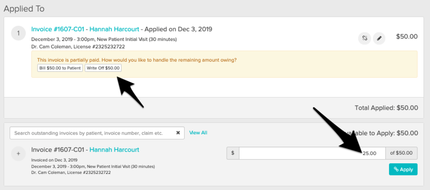 If you are recording an underpayment you will then have the option to Write Off the remaining balance or Bill the remaining balance to patient.