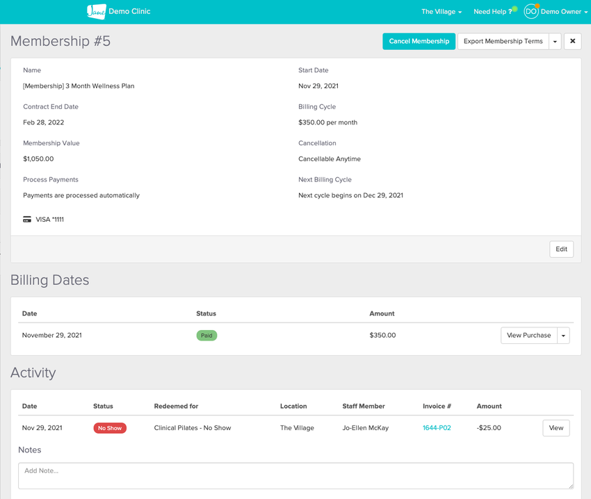 - Option 2: Opt not to redeem a membership use for this session, and choose one of the clinic’s existing No Show Fees to invoice for this appointment instead