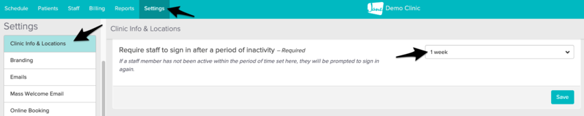 Knowing that it’s all too easy to forget to log out, you can enable auto-logout in your Jane account and this setting will effect all staff members within your account. In Settings > Clinic Info & Locations, you can set auto-logout for a minimum of 10 minutes or a maximum of 1 week depending on your preference:
