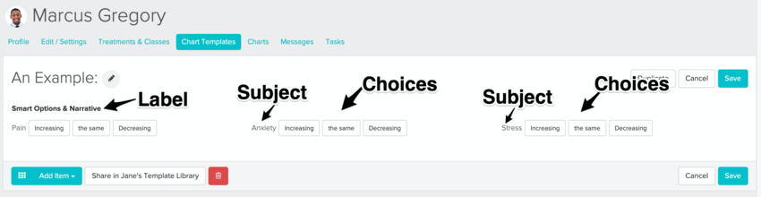 First – what is a charting “Narrative”? Jane grabs the text that you’ve entered into specific text fields referred to as subjects & choices (your “Smart Options”) to auto-generate a summary of your findings (your “Narrative”).