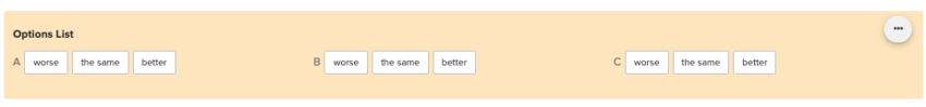 This includes an intro, middle, and outro (ending). Using the variables for the subjects and choices, Jane will build a sentence as options are selected.